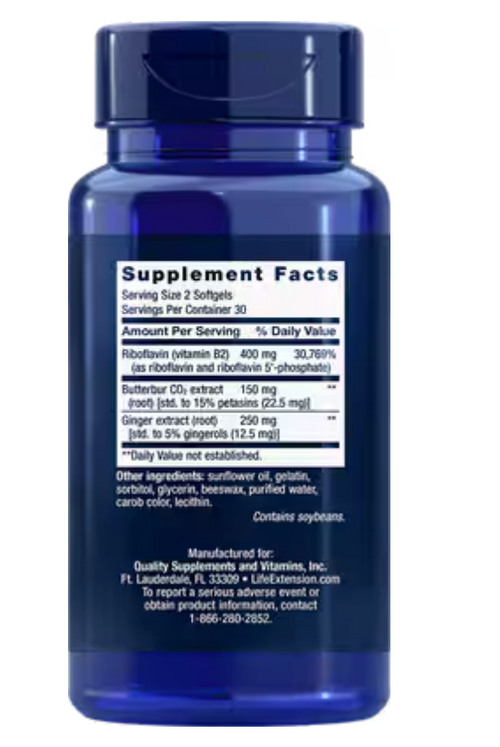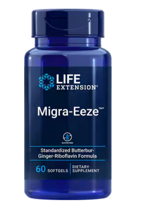 Life Extension Migra-Eeze® is a scientifically advanced dietary supplement featuring a specialized blend of standardized butterbur, ginger, and riboflavin. This unique formula is designed to help support a healthy migraine response.
