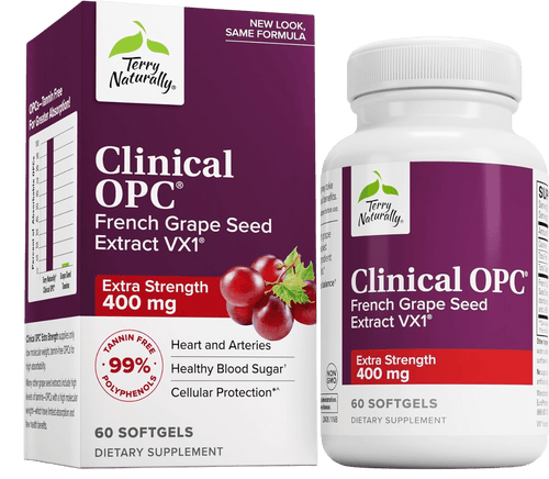 Terry Naturally Clinical OPC Extra Strength delivers powerful antioxidant support with a highly concentrated blend of oligomeric proanthocyanidins (OPCs) from French grape seed extract. This clinically inspired formula provides superior free radical protection to support cardiovascular health, healthy aging, and overall cellular wellness.